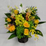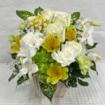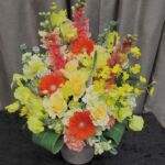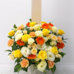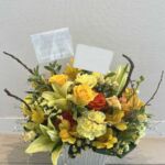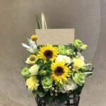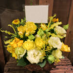 明るい色は「物そのものの大きさより、さらに大きく見せる効果(膨張色)」がある為、お花の色の中で一番明るい黄色の入ったフラワーギフトはとても目を引きます。